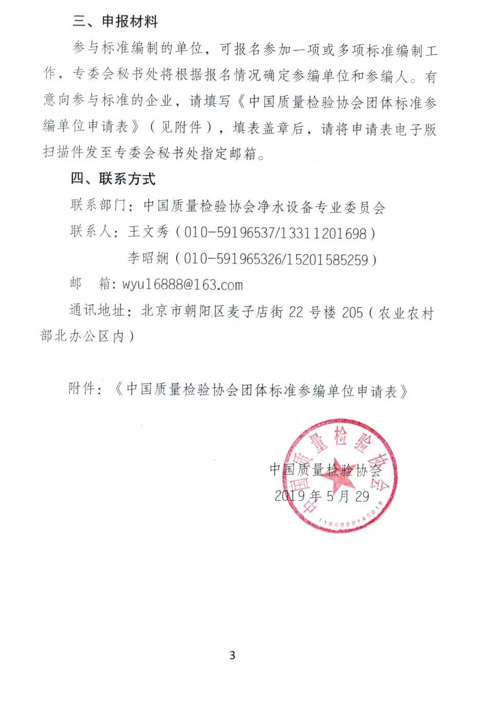 为保护相关企业和消费者的利益,充分发挥相关单位参与标准制定的积极性,进一步推动净水行业技术创新和发展,保证标准编写质量和水平,按时完成团体标准制定任务,中国质量检验协会向社会公开征集该9项团体标准的参编单位,现将有关事项通知如下: