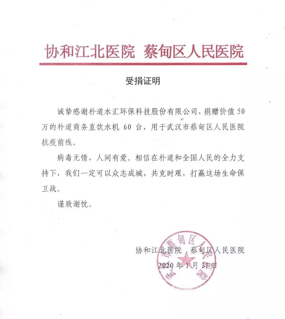 自新冠冠状病毒感染的肺炎疫情发生以来,湖北武汉成为重灾区,随着疫情蔓延,前线不断传来医疗物资告急的消息。除夕夜,海陆空三军医疗力量奔赴前线驰援武汉。一方有难,八方支援,企业纷纷紧急行动起来,捐款或捐物。朴道水汇心系武汉,与疫区人民一起打赢“健康”保卫战。